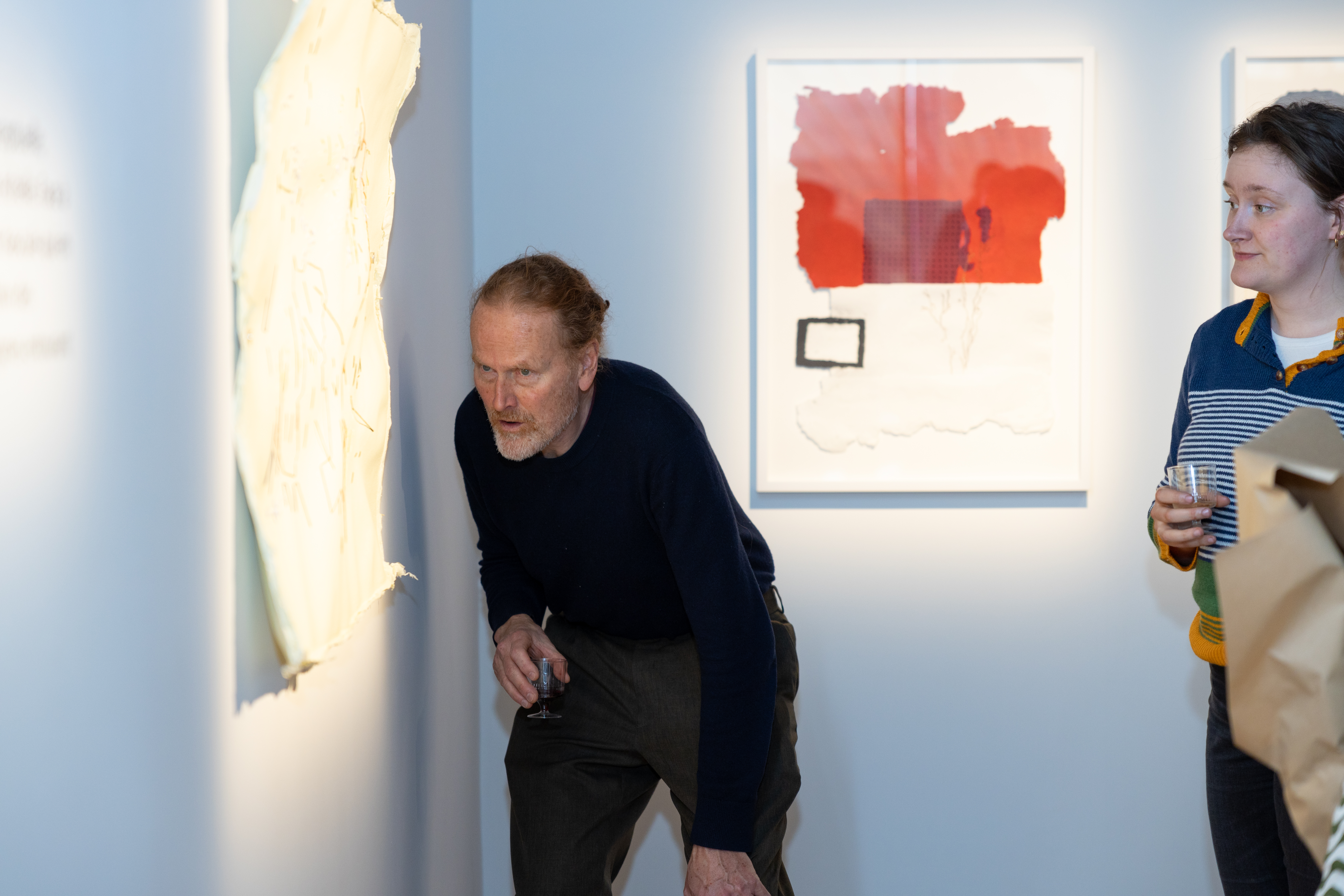 Plus loin dans l’espace d‘exposition, on découvre une œuvre dont le jeu d’échelle convie à l’observer des motifs de sécurité apposés au revers des enveloppes postales. Servant à garder indéchiffrable le contenu des lettres, la présence de TGF (très grande feuille) nous happe comme une nécessité de réfléchir à l’utilisation même du papier en cette époque qui est la nôtre. En effet, comment cette matière (qui est le médium de prédilection de Buist), préserve-t-il sa valeur face aux innovations technologiques ? Serait-il possible de croire que l’essence de la fibre du papier que l’on peut détenir en nos mains rend son contenu plus précieux, unique, authentique?